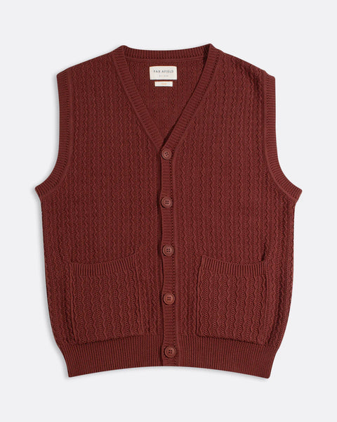 A knitted vest in organic cotton, worked in a dense cable-style stitch with a pronounced, tactile surface.