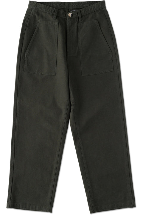 Fixed waist high rise wide crop leg pant, button and zip fly, utility patch pockets on front and back with patterned webbing detail, belt loops, bar tacks at all stress points, thick thread and double needle reinforced seams.